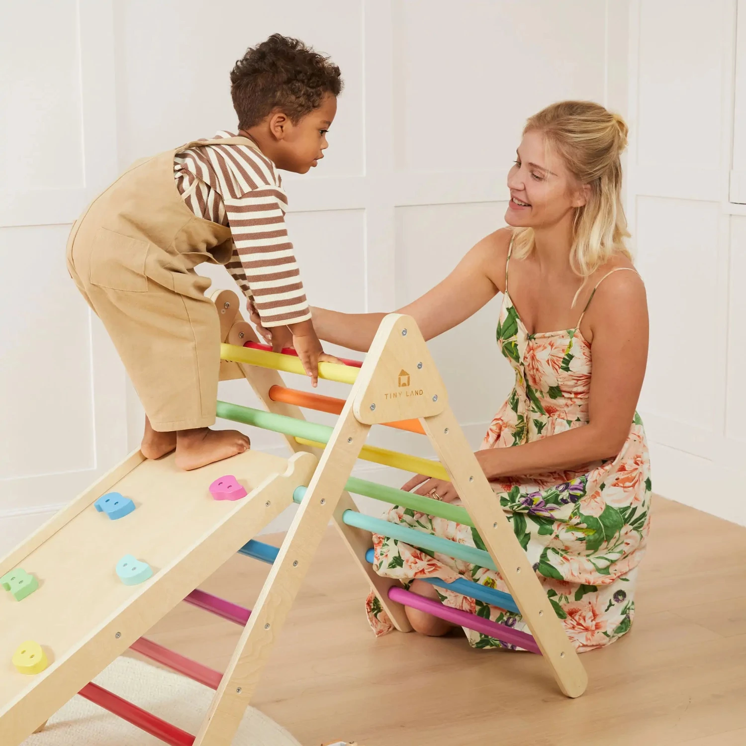 Unleash a world of learning and fun with the Tiny Land 7-in-1 Rainbow Climbing Set! This vibrant and versatile Montessori toy is perfect for fearless tots ready to take on the world. With its rainbow-colored rungs, it’s a journey of colors, coordination, and endless laughter. Designed for safety and durability, this set guarantees hours of engaging play. Our versatile 7-in-1 Rainbow Climbing Set offers endless play possibilities, bright colors, and sturdy safety – perfect for energetic little ones!