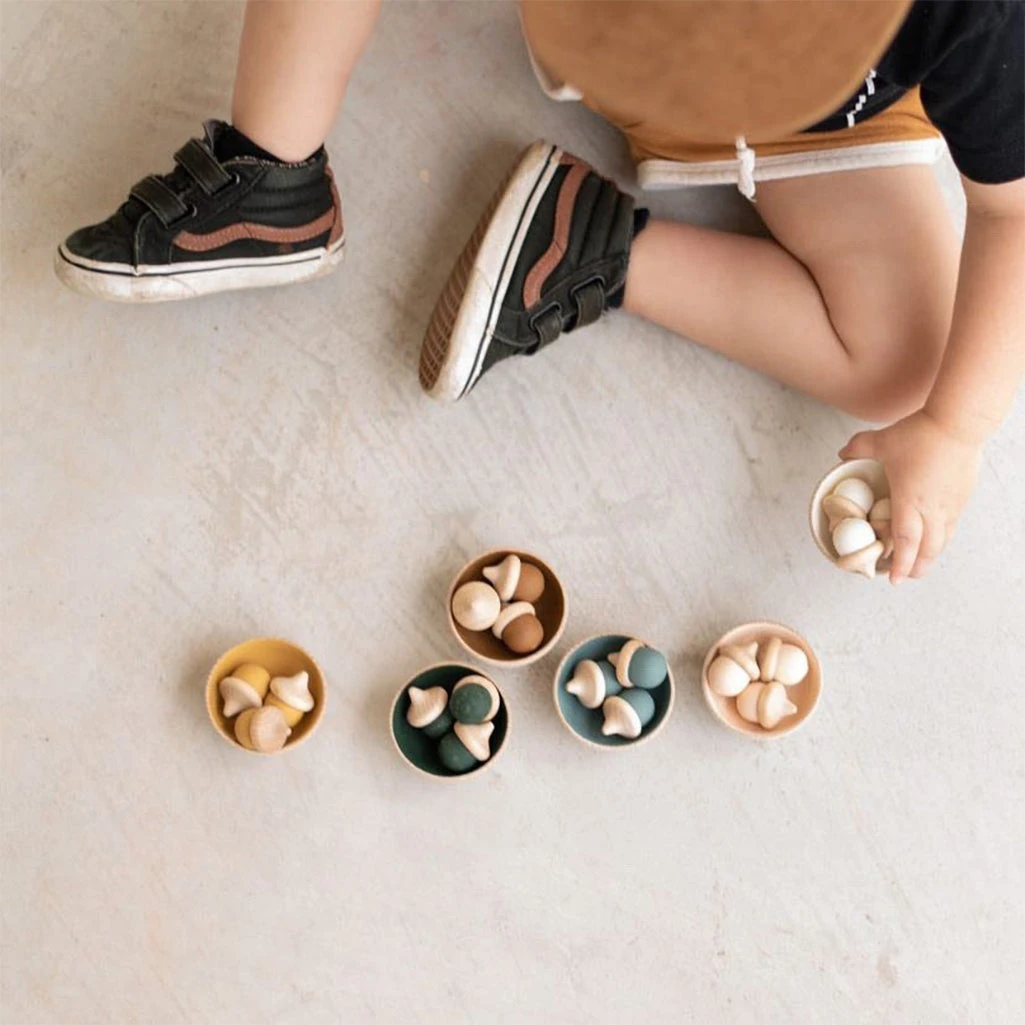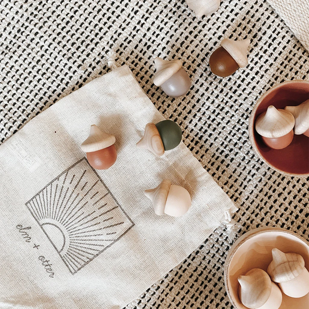 The Montessori acorn set by elm + otter is meant to reinforce knowledge of colors, sorting and counting. With beautiful, timeless colors, this little set will do well in any house and can be used for hours of open-ended play.