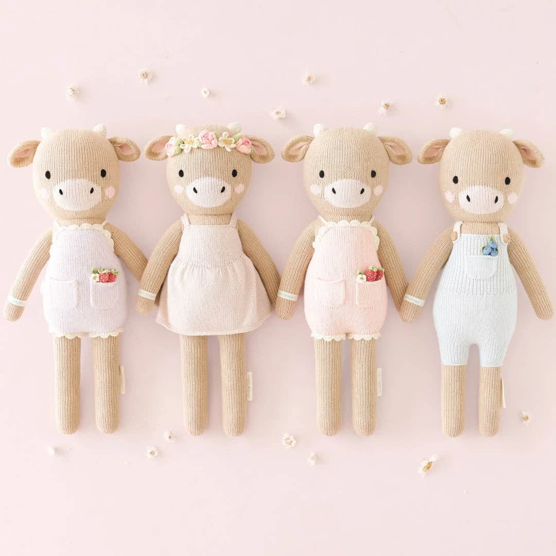 Amelia the Cow is a sweet and gentle friend with a heart full of love. Thoughtfully hand-knit with premium cotton and careful detail, Amelia is made to be cherished. Each purchase feeds children in need and uplifts artisans with fair trade income.