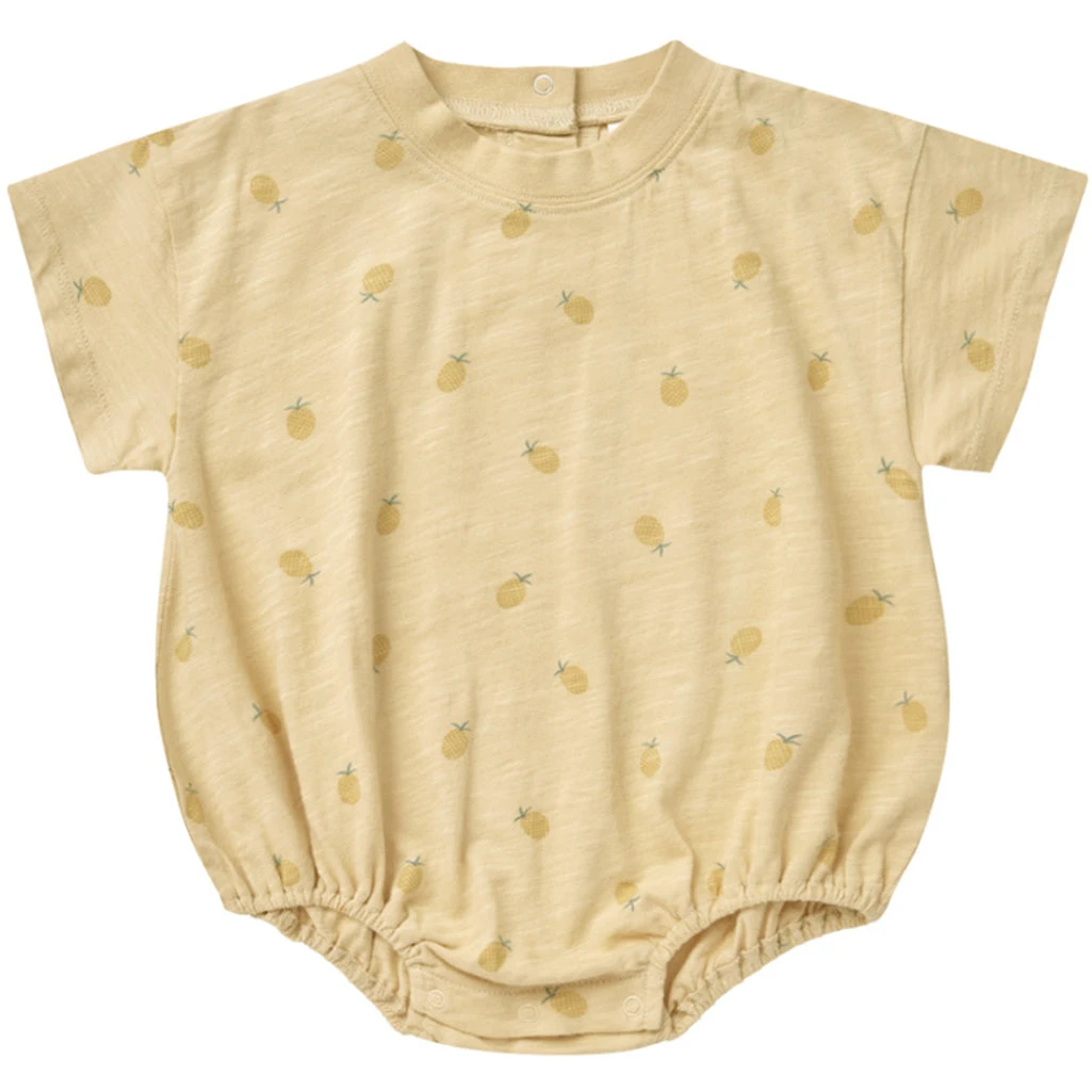 This bubble romper is perfect for summer! It has elastic leg openings and a bottom snap closure for easy changes. The pineapple print on a pastel yellow background adds a touch of whimsy for the warm months.