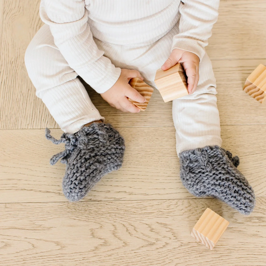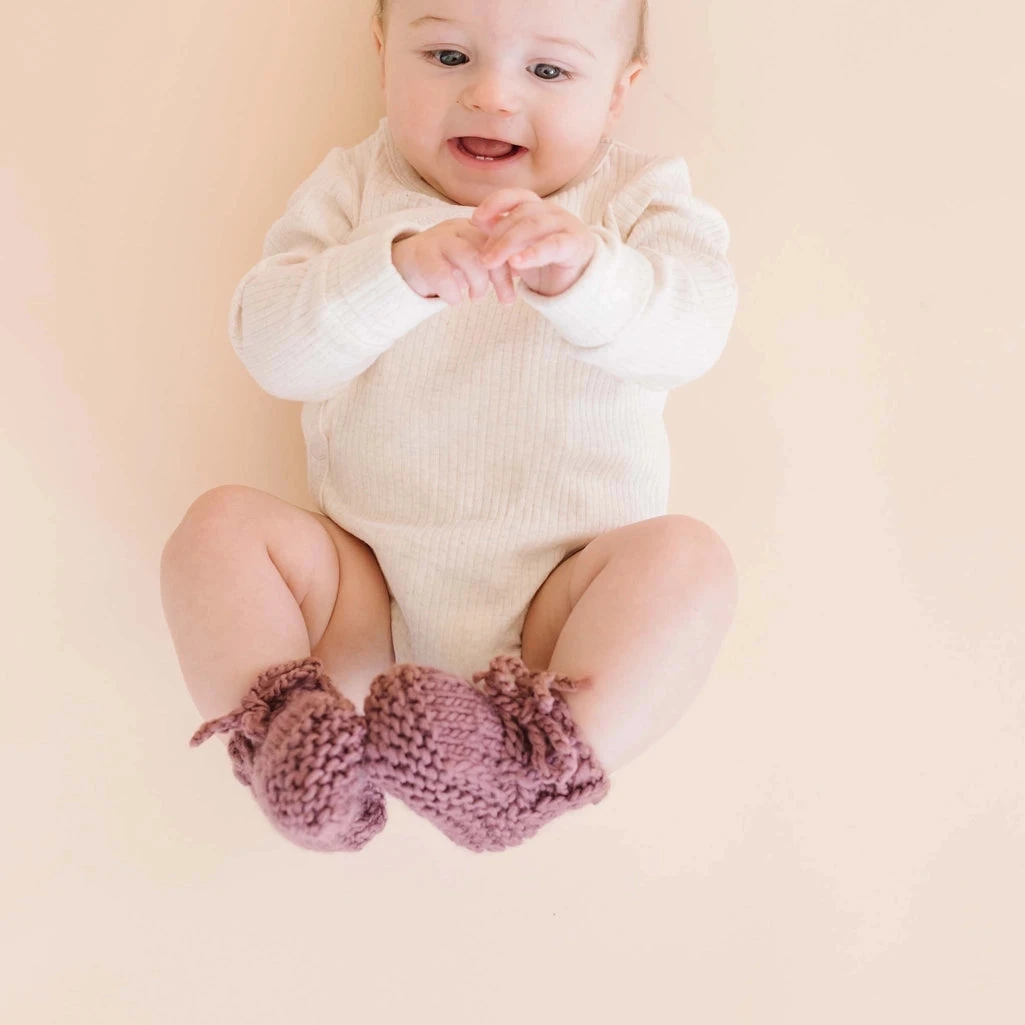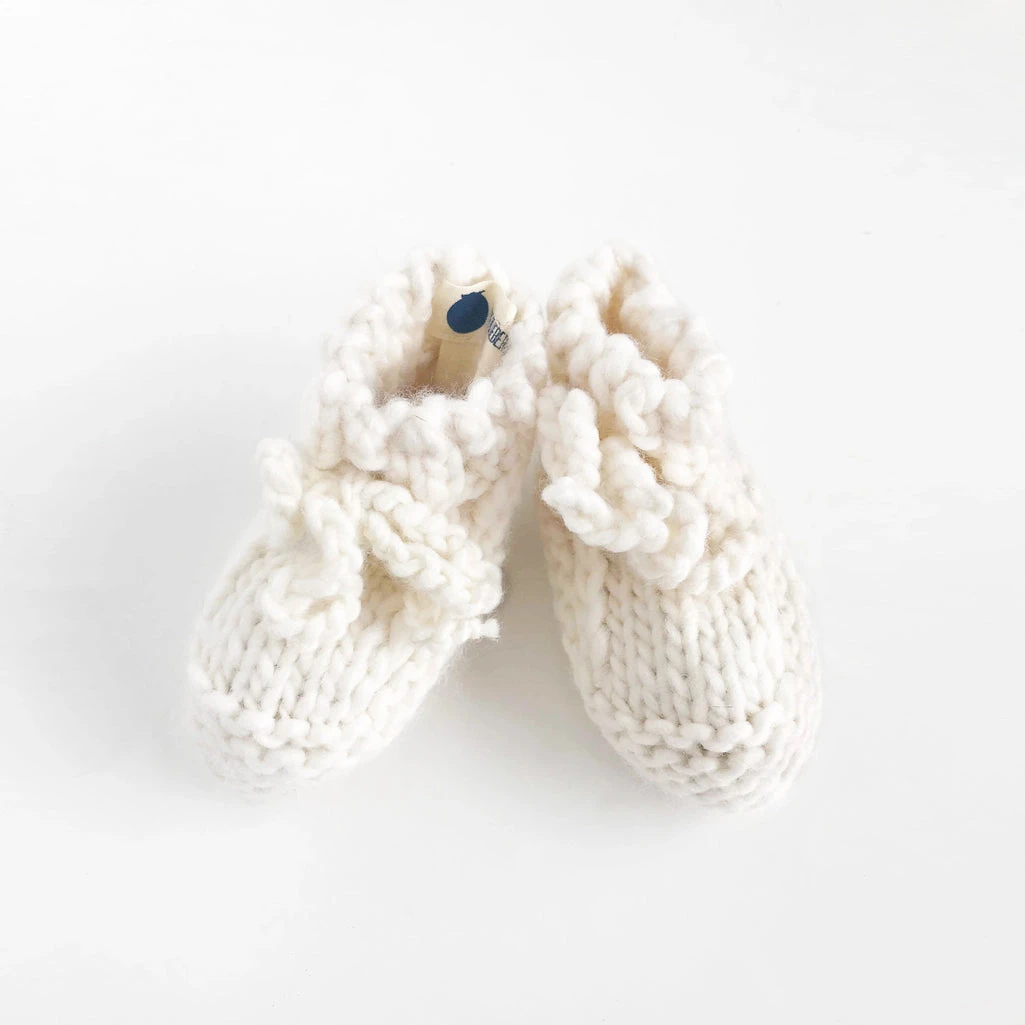 Complete the outfit with these darling little boots for the tiniest of feet! These adorable booties perfectly pair with our bloomers, sweaters, and hats. With knitted ties to keep them securely on tiny feet, they come in all the colors you need to match their entire ensemble.