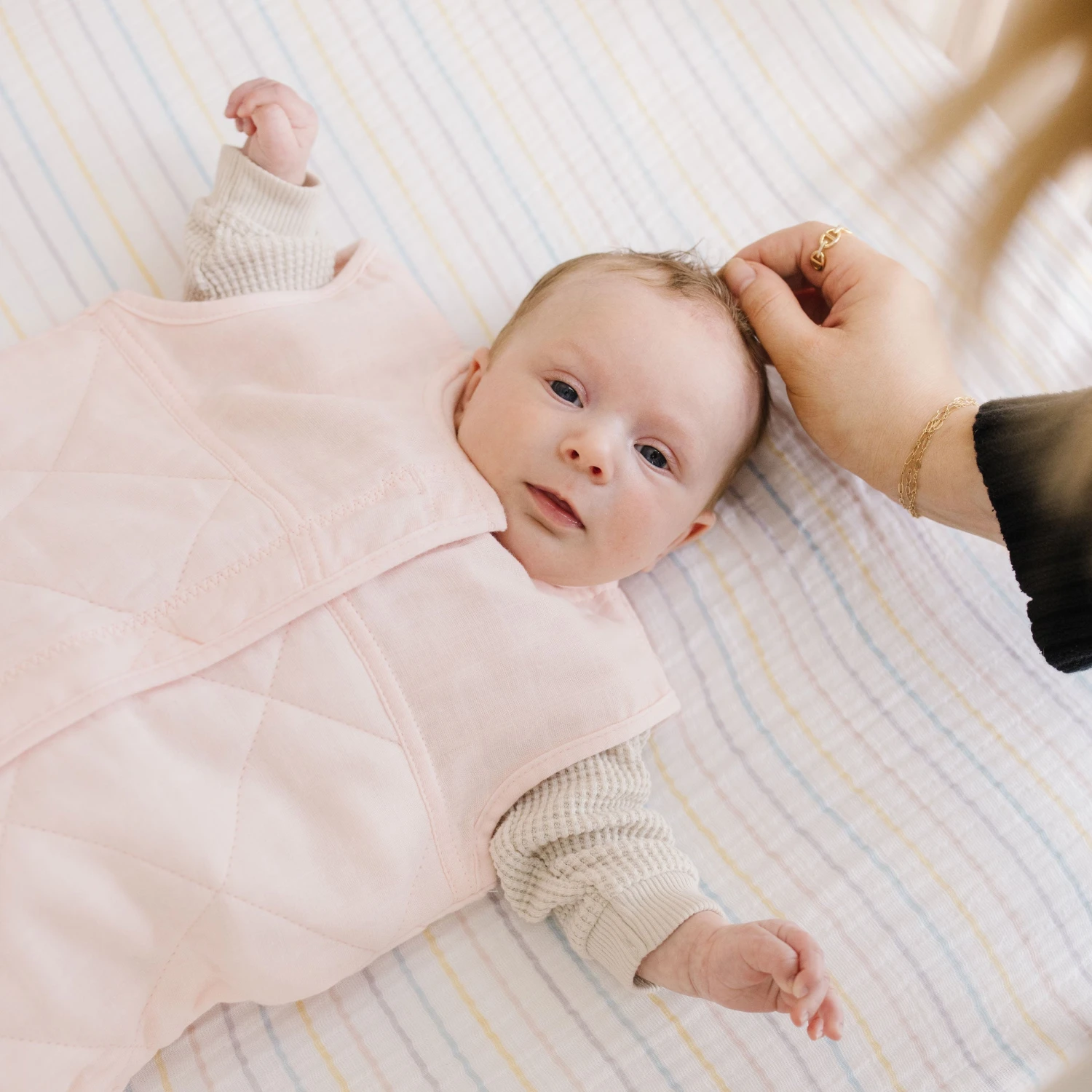 Designed for ultimate comfort, our Quilted Sleep Bags in Light Pink offer a secure alternative to traditional blankets during cooler seasons. The quilted cotton muslin construction traps warmth while maintaining breathability, ensuring your baby stays at the perfect temperature all night. Parents will appreciate the convenient two-way zipper for hassle-free diaper changes and the machine-washable fabric that becomes increasingly softer with each wash. Adorned with our exclusive hand-painted patterns, this sleep bag combines safety, functionality, and style for your little one’s peaceful slumber.