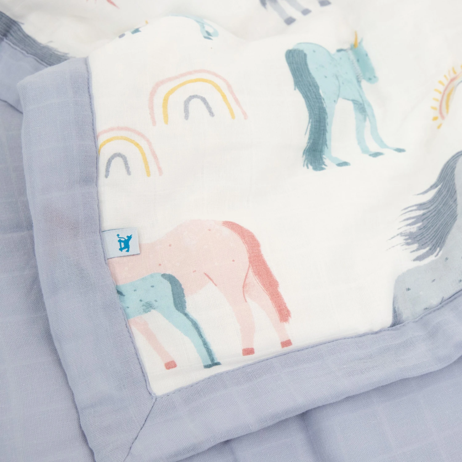 Spark your toddler’s creativity with the Little Unicorn cotton muslin Toddler Comforter featuring magical unicorns. Crafted from soft, breathable cotton muslin, this comforter is light, fluffy, and perfect for keeping your little one snug year-round. Tailored to fit a converted toddler bed just right, it avoids any extra bulk, making bedtime comfy and fun.