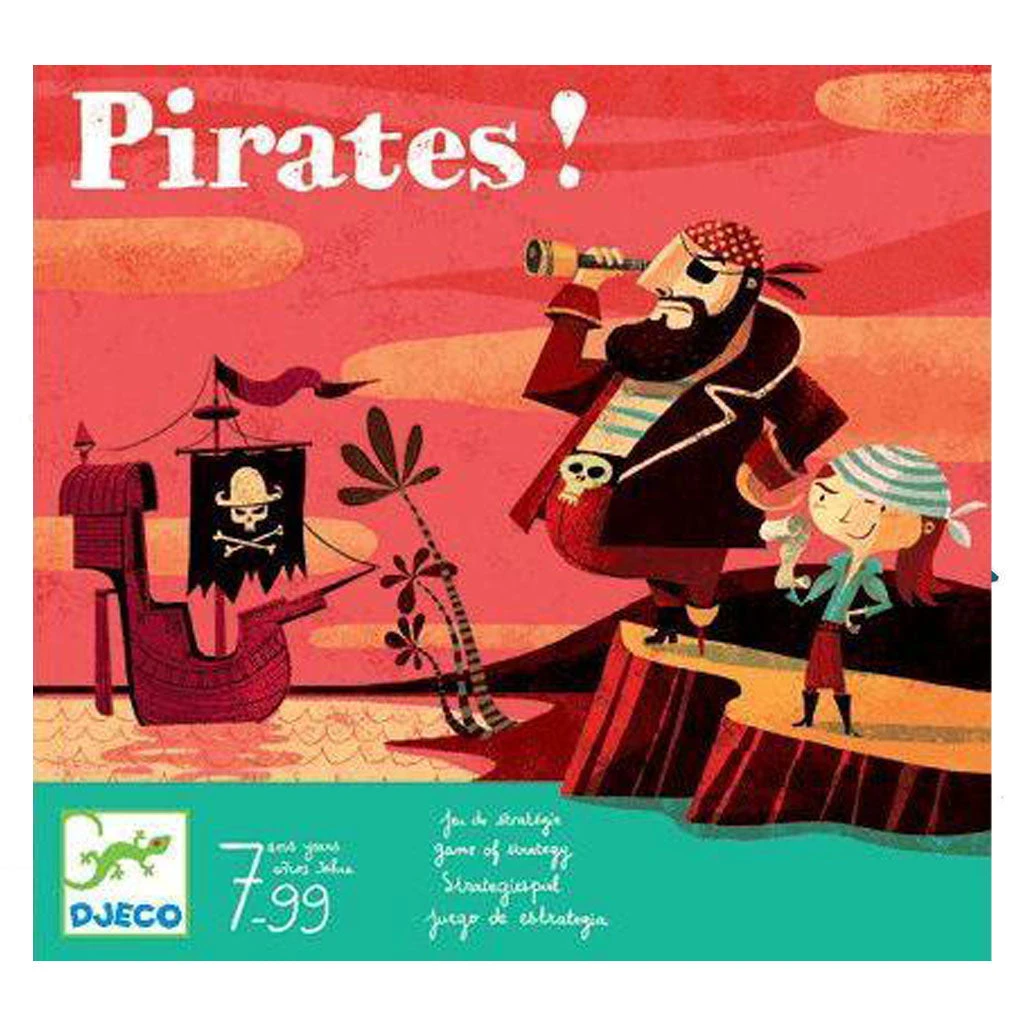 Djeco Pirates! is a strategy board game where players place their game pieces on the board to match their treasure maps and win gold!