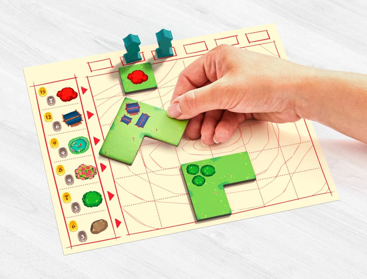 As the game progresses, you can also build upwards, placing garden tiles on top of other garden tiles. Receive points during the game for your placed garden tiles, scoring more points the higher the layer, with a bonus for the fifth layer. At the end of the game players receive extra points for having the most objects in their gardens. The highest score wins!