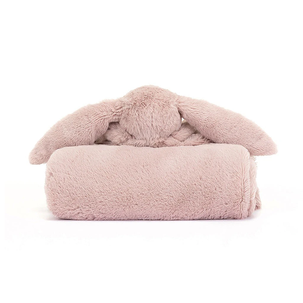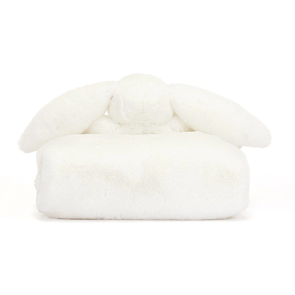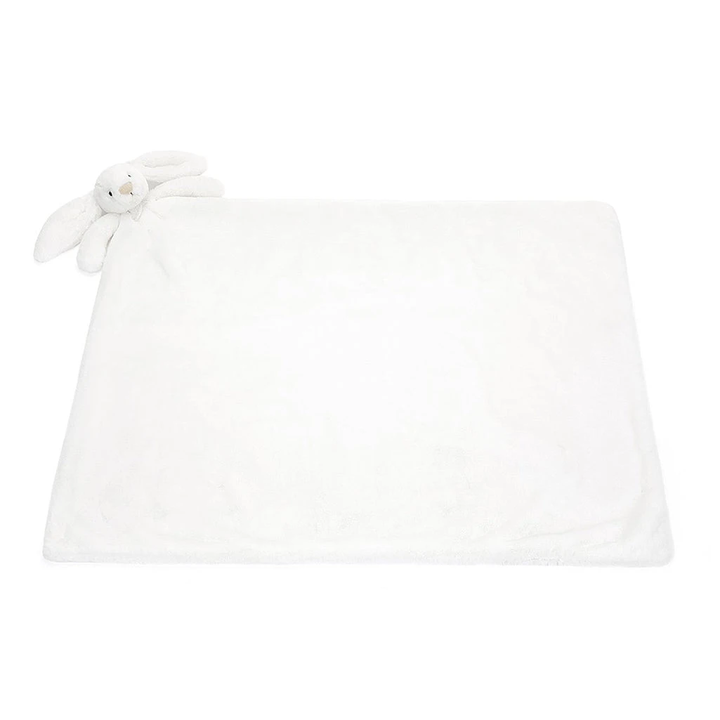 A luxurious newborn gift, Bashful Bunny Blankie is exquisitely soft. Featuring the head and paws of the Jellycat Bashful Bunnies in the corner of a silky soft blanket. Rolled and wrapped with a grosgrain ribbon and elegantly presented in a satin sheen gift box with a gold foil detail and matching gift card.