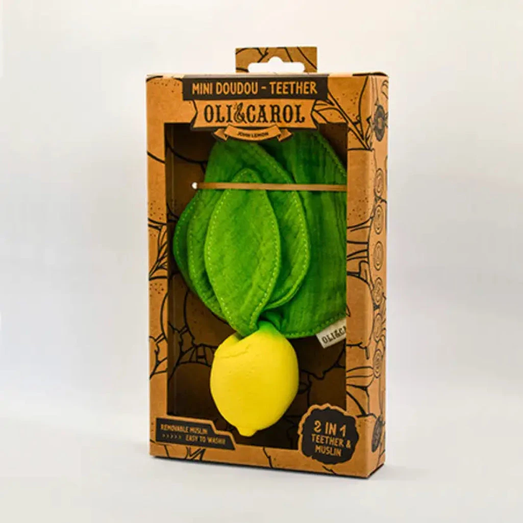 Get the best of both worlds with the Oli & Carol 2-in-1 Lemon Mini Teether and Duoduo! This product is a teether and soother. Easily tie or untie the muslin lemon leaf for washing.
