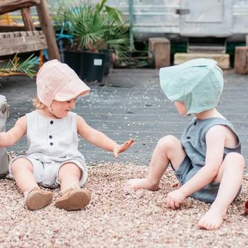 These Linen Bonnets from Kyte Baby are the perfect addition to any outfit.  These bonnets are made with a wide brim, offering sun protection, and have an adjustable snap closure for safety and comfort.
