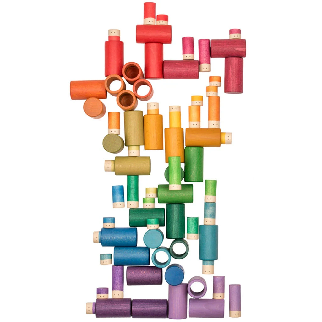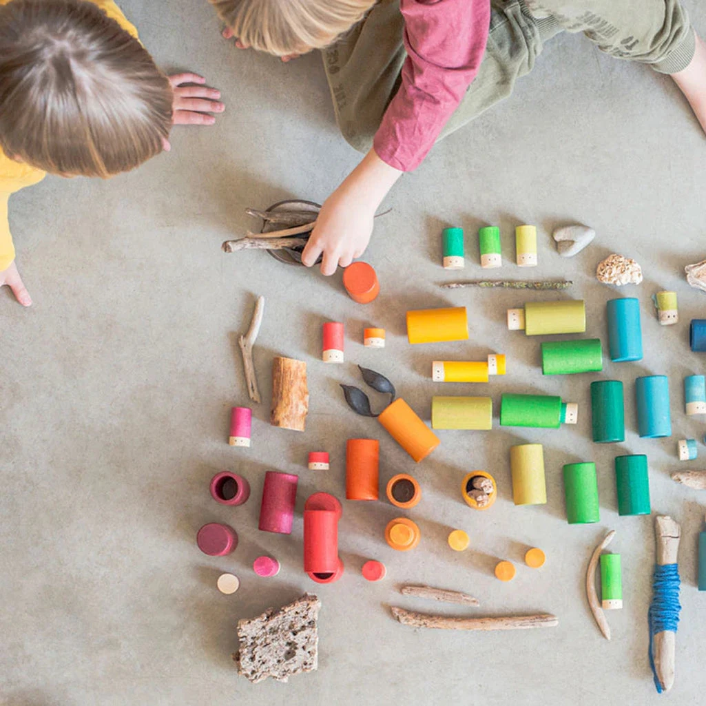 The mini Lola and variety of tubes also encourage symbolic play and the creation of Mini Worlds. This set includes 12 big Lola, 12 mid Lola, 12 small Lola, 12 Tubes, 12 Solid Tubes, and 12 half Tubes, all designed by Grapat for open-ended play that sparks the imagination and encourages creativity.