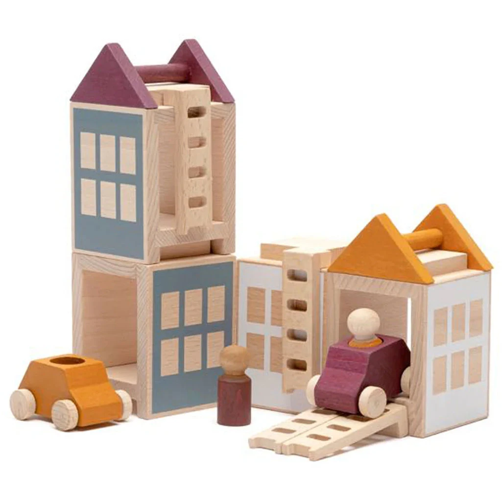 - Includes: 4 buildings with ladders, 2 toy cars with wooden figures, and 2 roofs