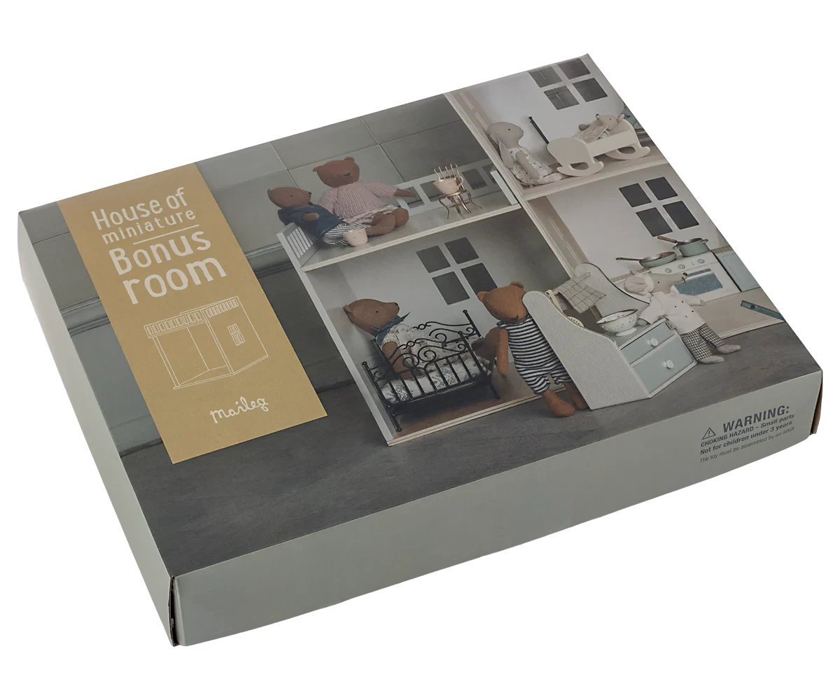 The Maileg House of Miniature Bonus Room invites your creativity to run wild! This versatile space can be anything you imagine—a cozy garage, a lively hangout for friends, or even a mini fitness studio. Add it anywhere in your dollhouse and watch your story unfold in endless playful ways. The choice is yours!