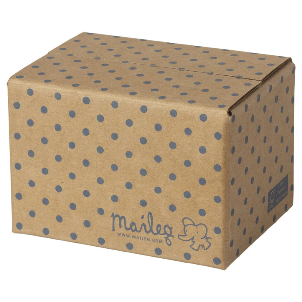 Fresh from the market and ready to feed all your Maileg Mice friends. This Miniature Grocery Box includes mayo, milk, honey jar, sausage, 4 ice cream sticks, egg carton, 2 soda cans and a cheese. This is a perfect Maileg dollhouse accessory.
