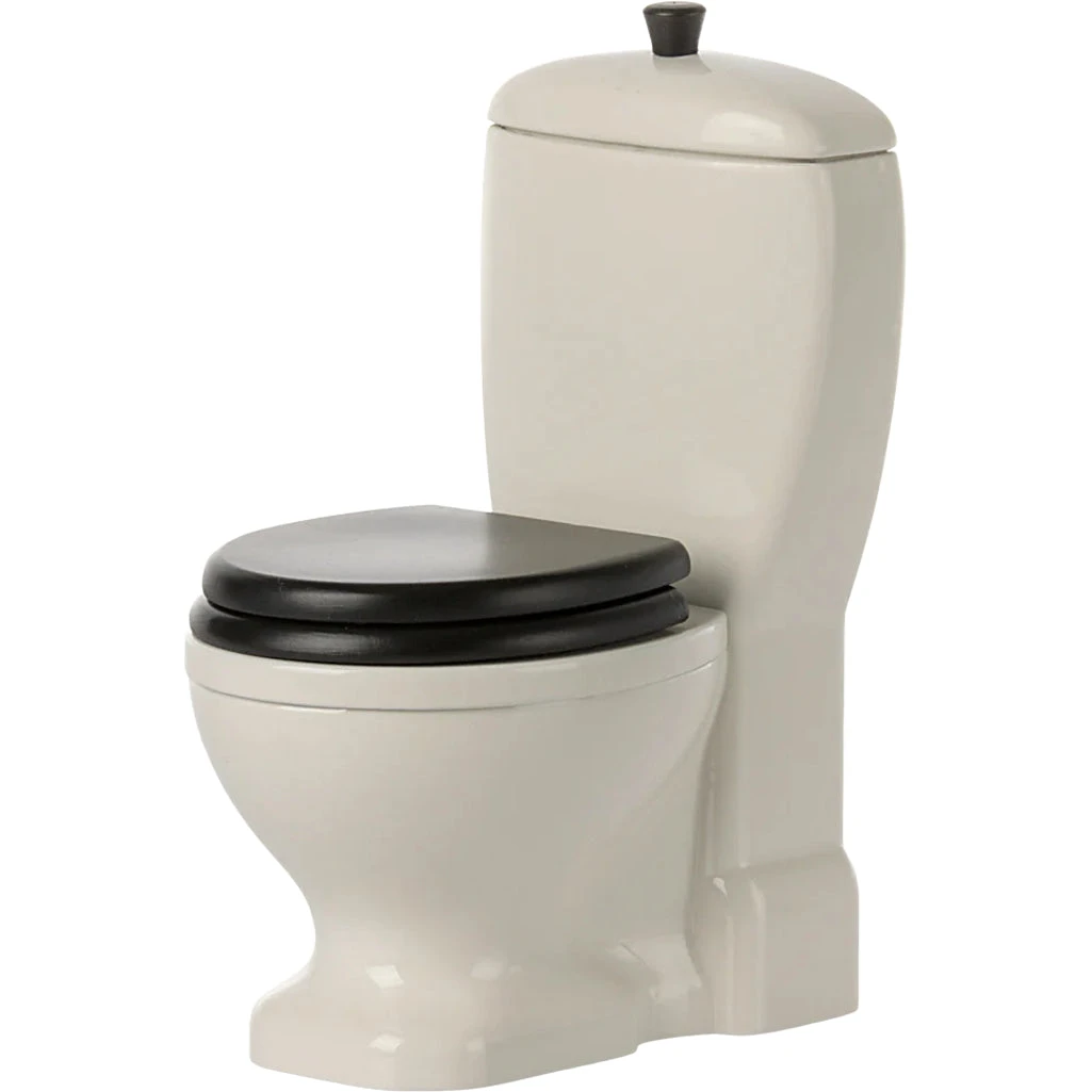 Complete your Maileg bathroom setup with this Miniature Toilet, designed for size 1, size 2, and Teddy family dolls. This beautifully crafted toilet features an off-white body with a black seat that opens and closes, along with a pull-function handle for a realistic touch. Perfect for imaginative play, this tiny toilet adds authenticity and fun to any maileg dollhouse.