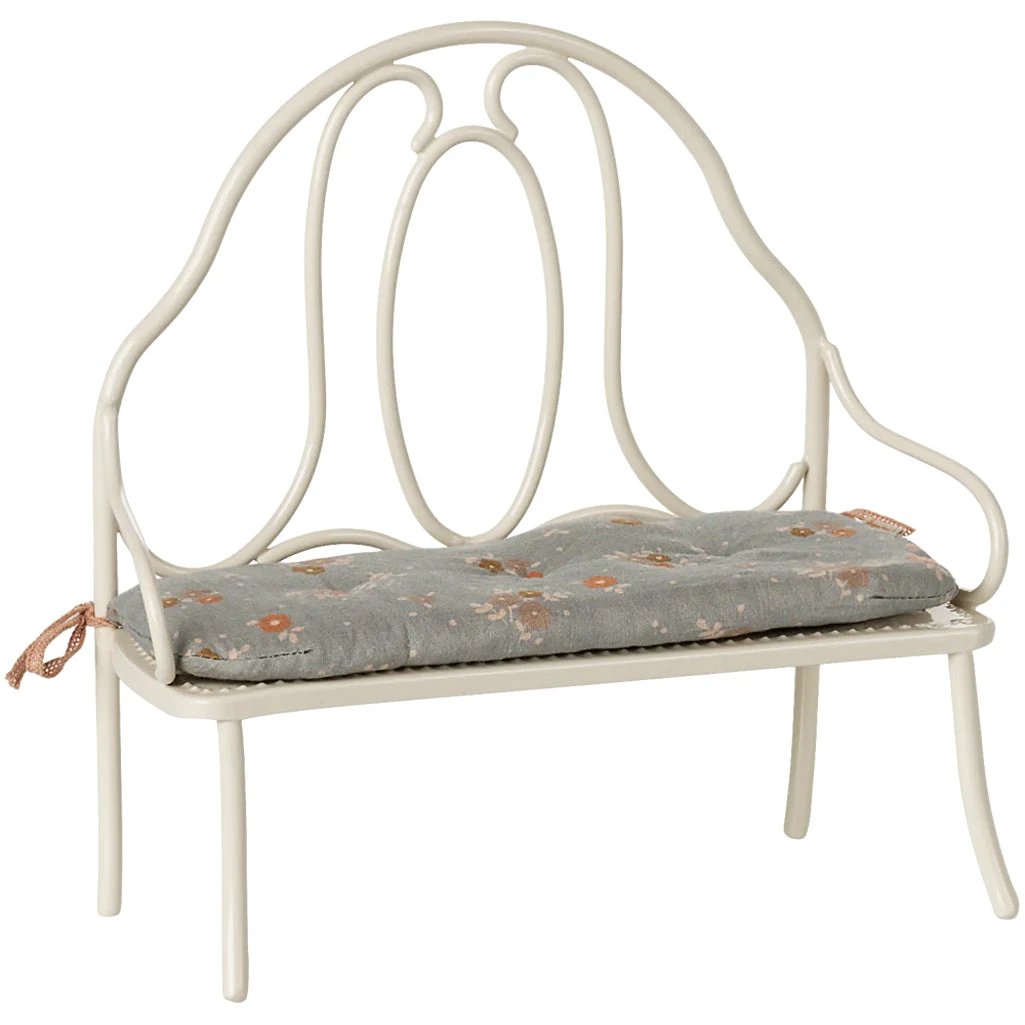 The Maileg Miniature Vintage Bench is a charming resting spot for Size 1 and 2 bunnies and rabbits. With a soft cushion and vintage-style metal frame, this bench brings timeless design and comfort to any Maileg home or garden scene.