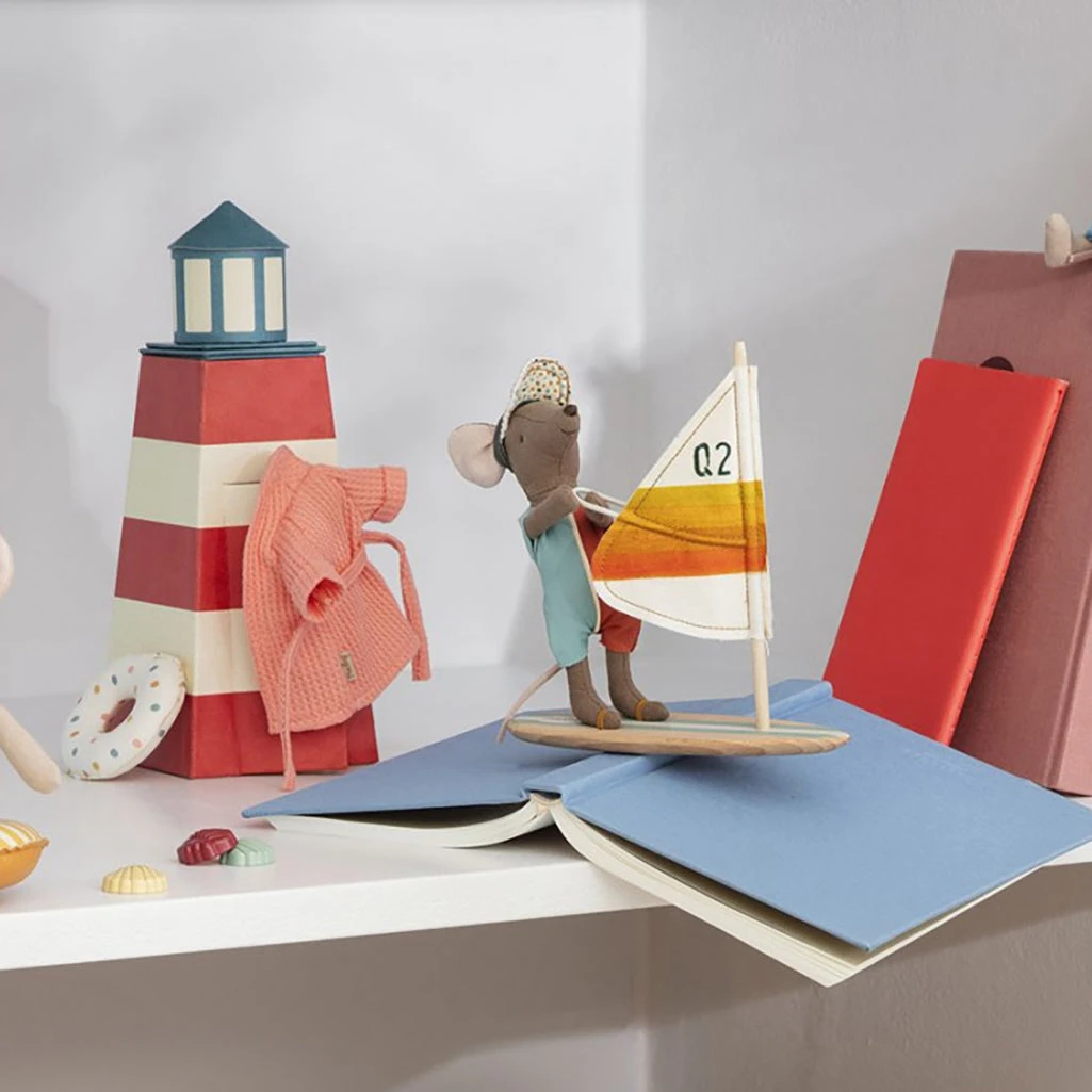 This big brother Maileg Mouse is wasting no time at the beach vacation. Add him to your growing collection of Maileg beach toys and friends! Surfs up!