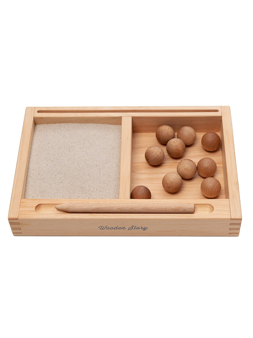 Get your child practicing writing letters, numbers, and shapes with this Montessori Sand Tray kit! They can also match objects to flashcards and create full words using their finger or the included wooden pencil. This set includes a card holder, two sections for sand and wooden balls, and a bag of sand.