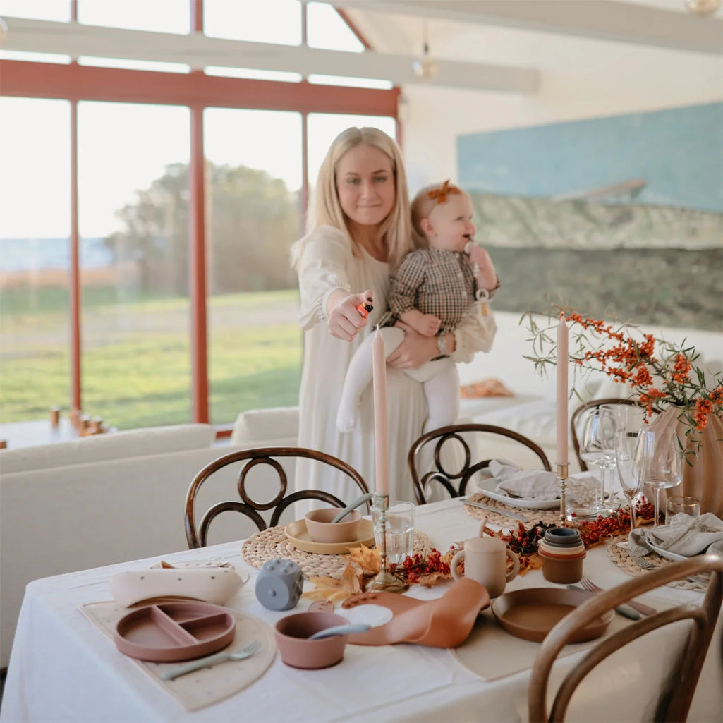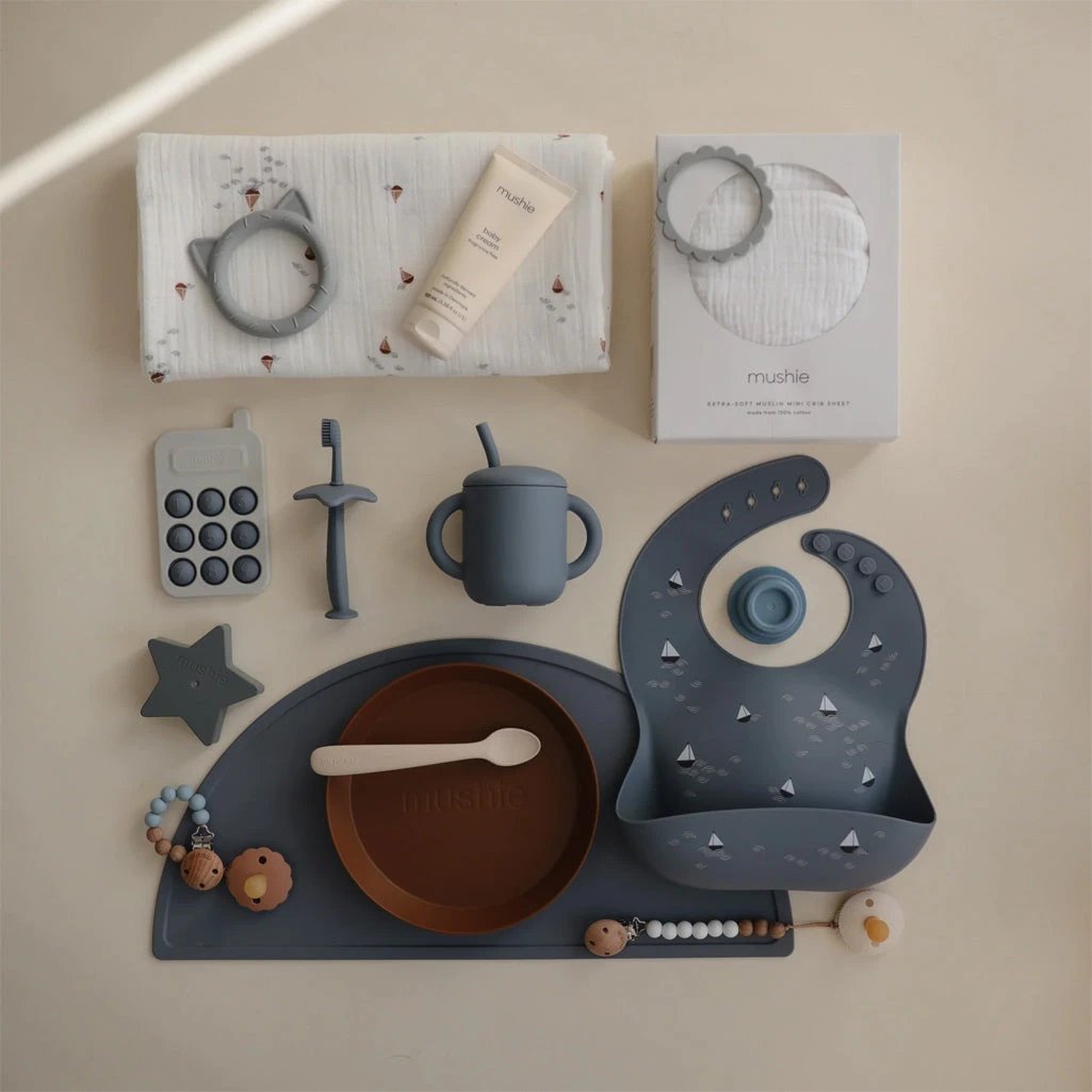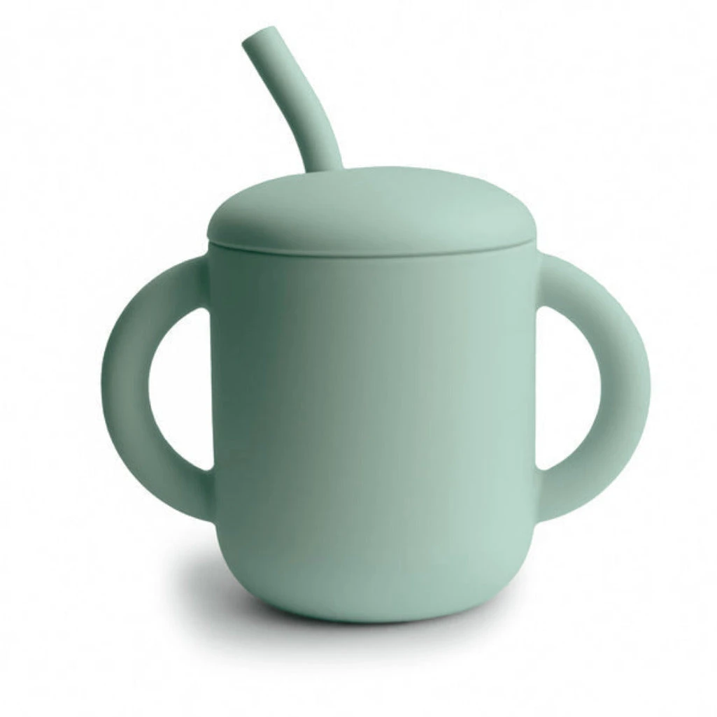 Build up baby’s fine motor skills with this training cup system from Mushie. Its minimal design and color makes it blend in any household, and the soft silicone makes it safe for baby teeth and gums while they make the transition from bottle to cup.