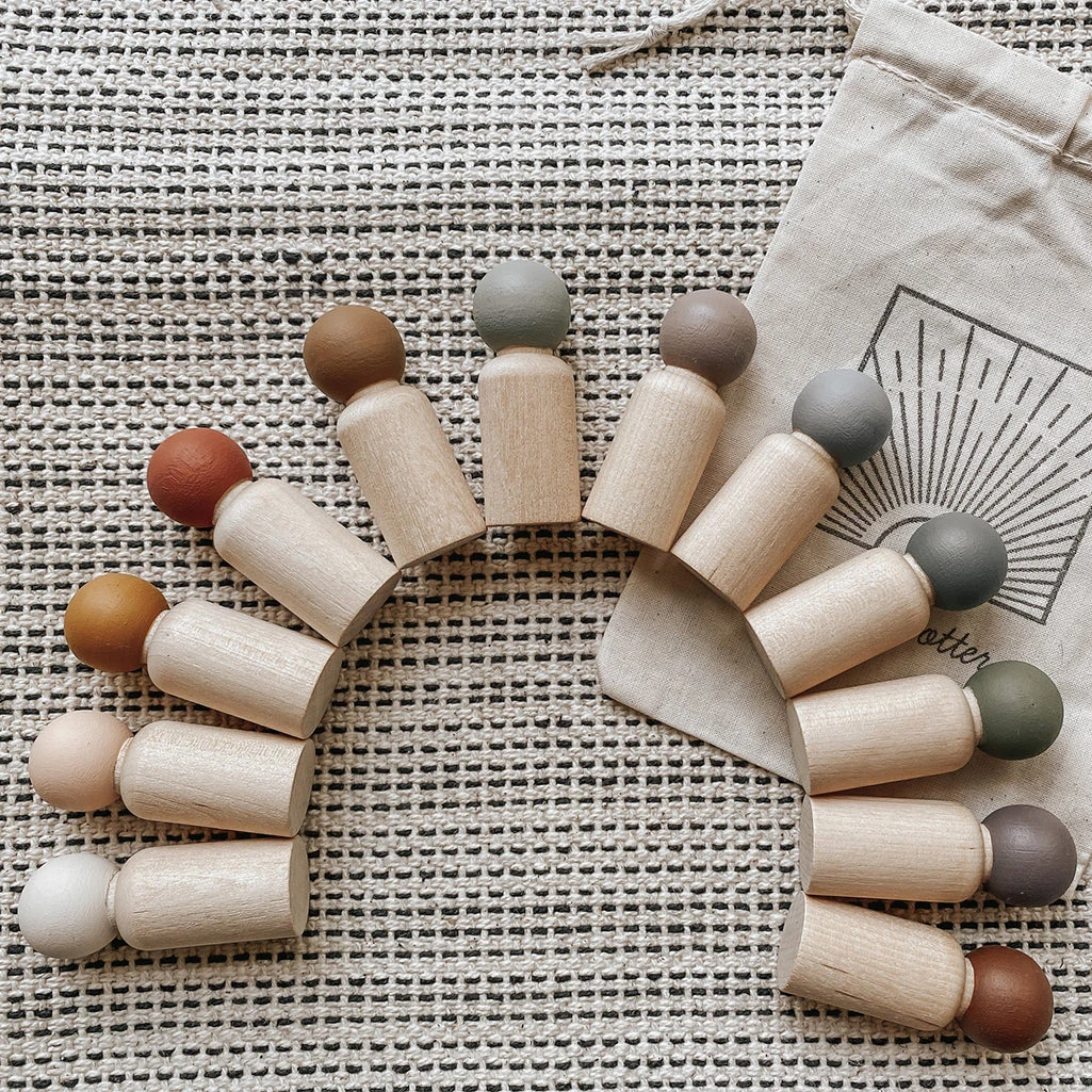 These simple peg dolls are Waldorf and Montessori inspired to teach children pretend play skills. Their open-ended concept means your child can play for hours, whether they are exploring communication, counting, family play and so much more. The desert tones set comes with 12 timeless colors that look great on any shelf when not being used.
