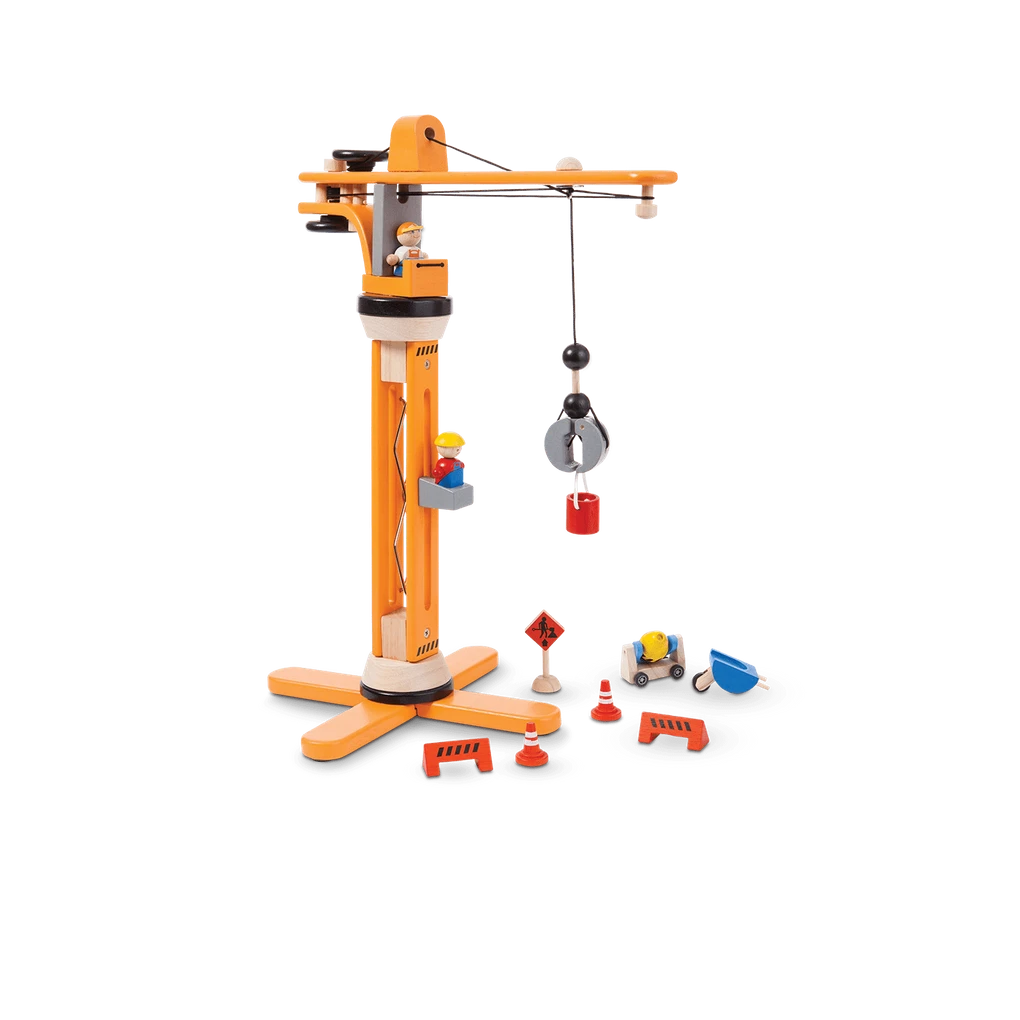 - The PlanToys Crane set comes with a crane, construction sign, street hazard signs, concrete mixer, and 2 figures of a foreman and worker.