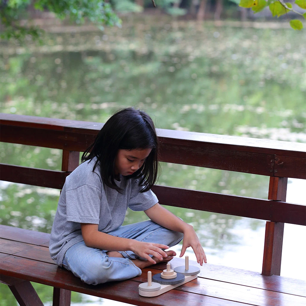 PlanToys Lucas Tower is designed to intellectually stimulate your thriving toddler’s problem solving skills, while improving fine motor and coordination development!Lucas Tower consists of three roads and five disks – each different in color and size and able to slide onto any of the rods. The stacking game begins with the disks neatly stacked in order of size on one rod, with the smallest at the top. Your little one must individually move each disk to another rod, and a larger disk cannot be placed on top of a smaller one. Let the game begin!