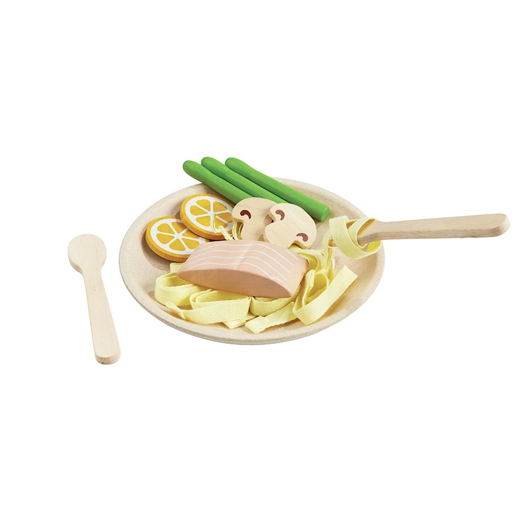 - Includes: a plate with spoon and fork, fettuccine, a slice of salmon, 3 pieces of asparagus, 2 pieces of lemon and a mushroom