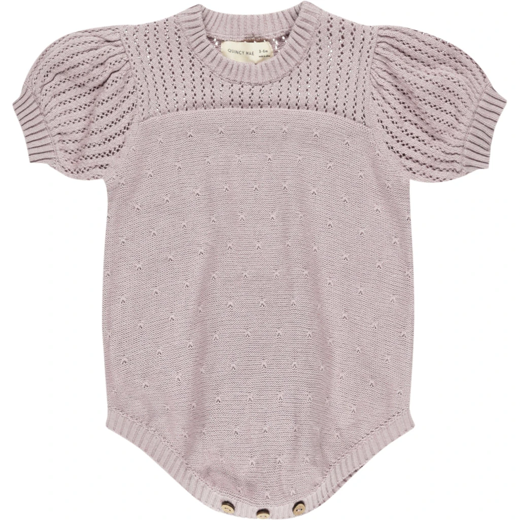 This vintage-inspired Pointelle Knit Romper features delicate knit detailing and ruffle trim for a timeless, elegant look. Available in a soft lavender hue, it’s perfect for special occasions and everyday wear.
