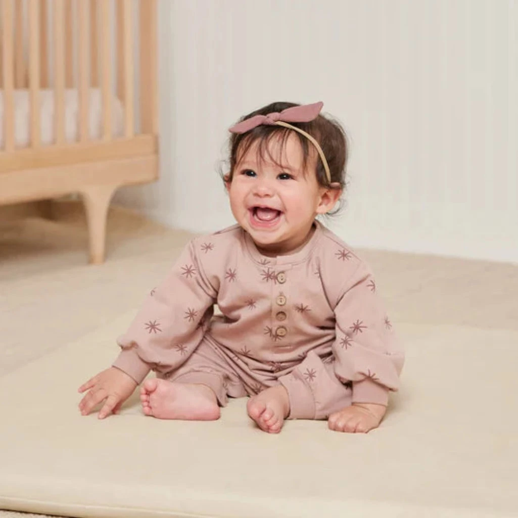 Discover the ultimate in comfort with Quincy Maes’ soft, long sleeve jumpsuit. It features charming coconut summarys adorning the chest and discreet hidden snaps along the inseam, providing effortless diaper changes for sizes ranging from 0-3 months to 18-24 months.
