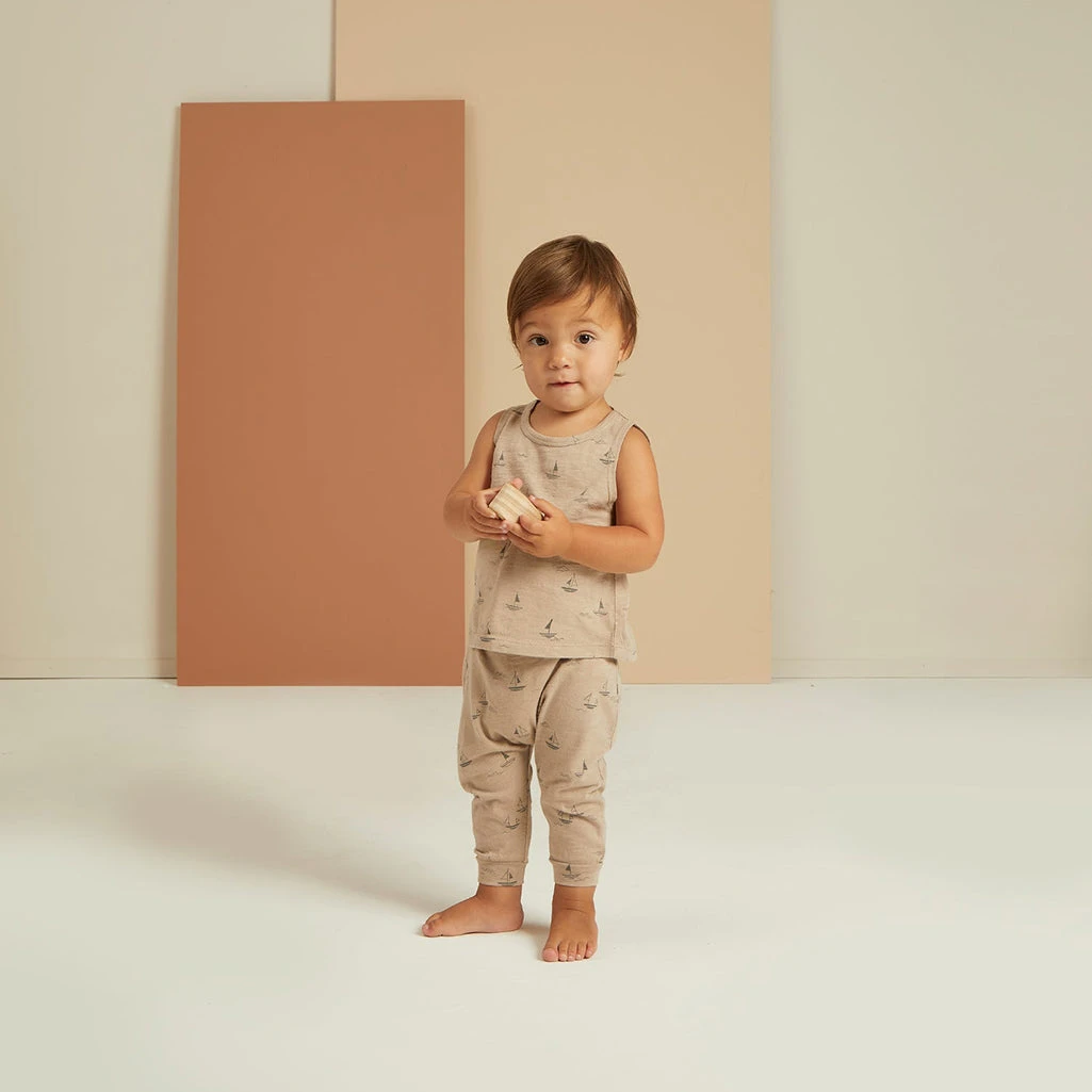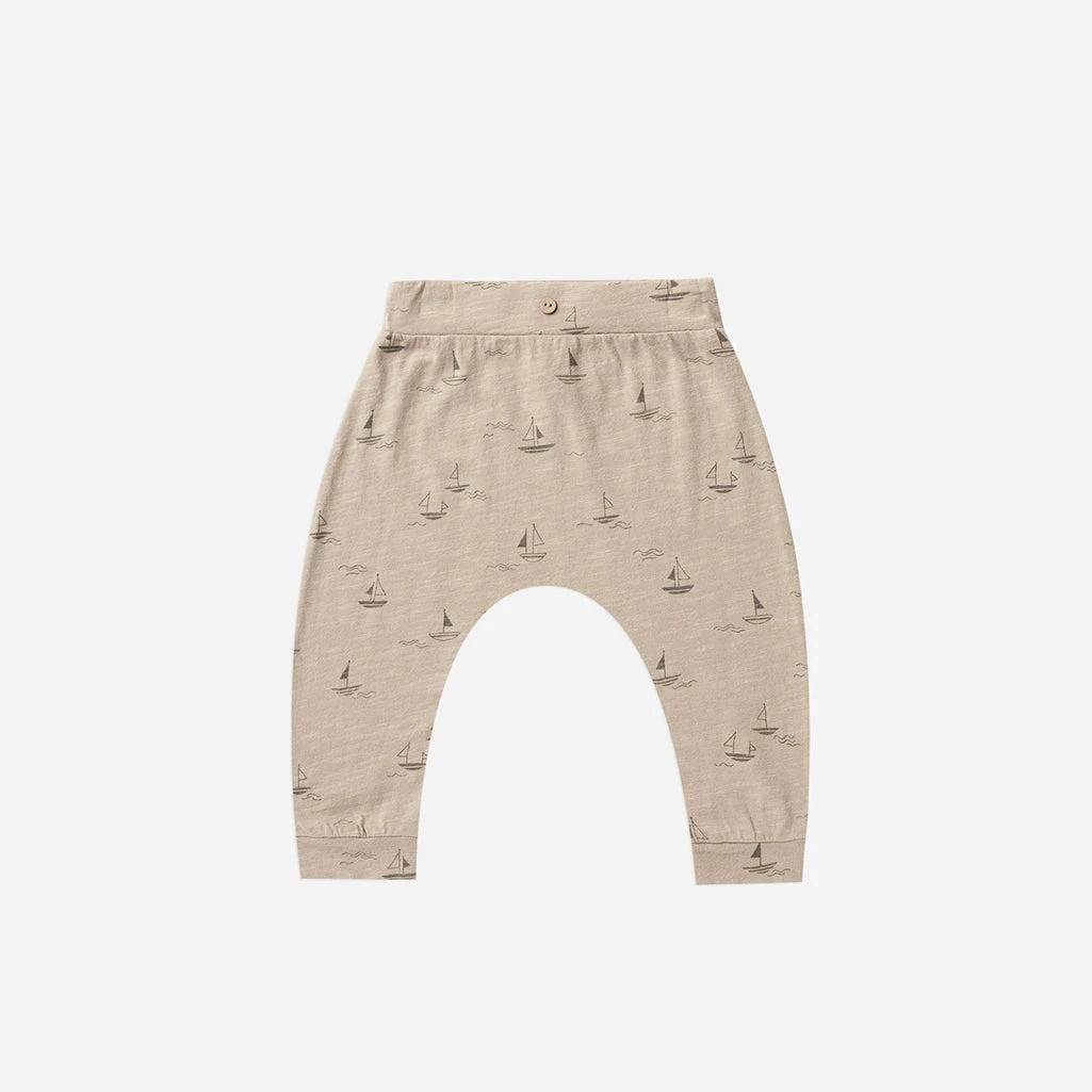 Soft slouch slub knit pant with elastic waist band and rolled cuffs for comfort.