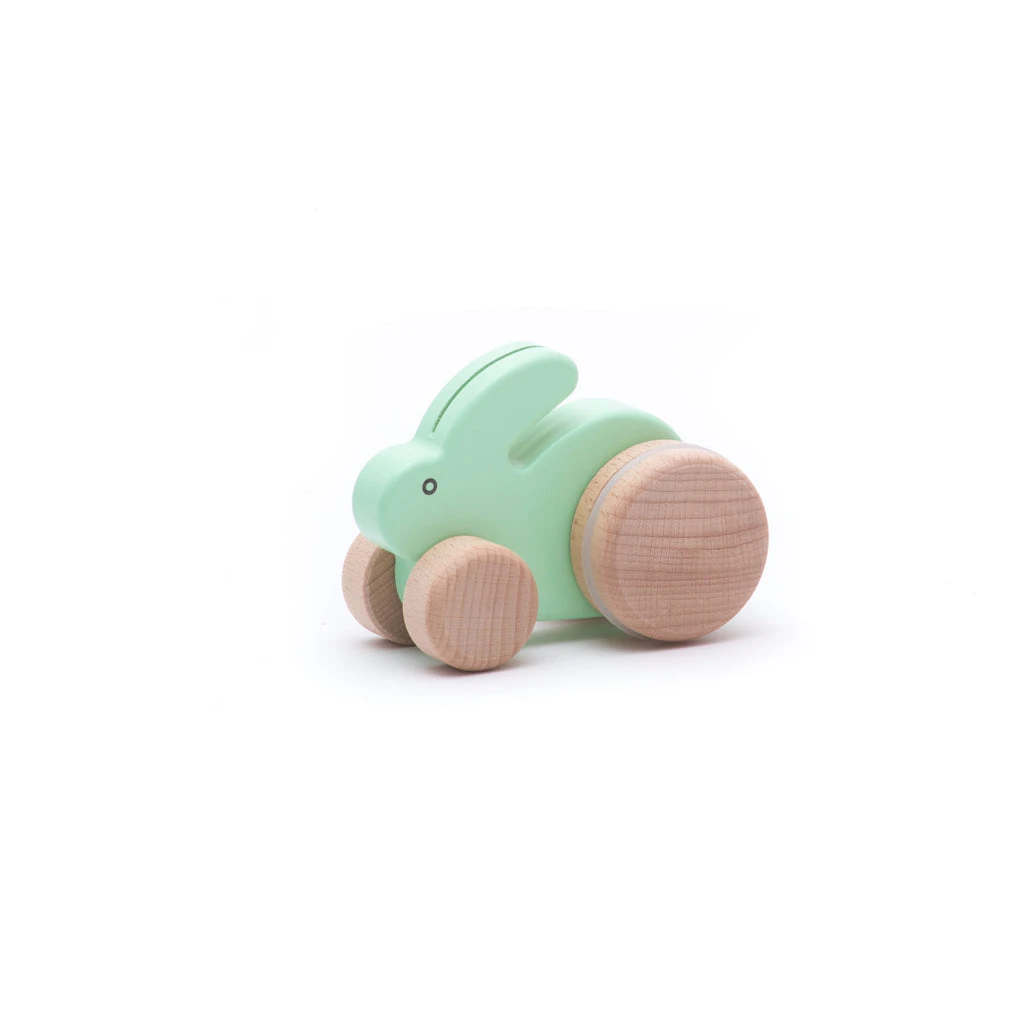 Your little one will enjoy watching the Bajo Hopping Rabbit as it hops across the floor. The wheels on this push wooden toy are not centered which is why the rabbit is able to make a hopping motion. Wheels have a rubber grip that makes it sturdy and perfect for little hands.