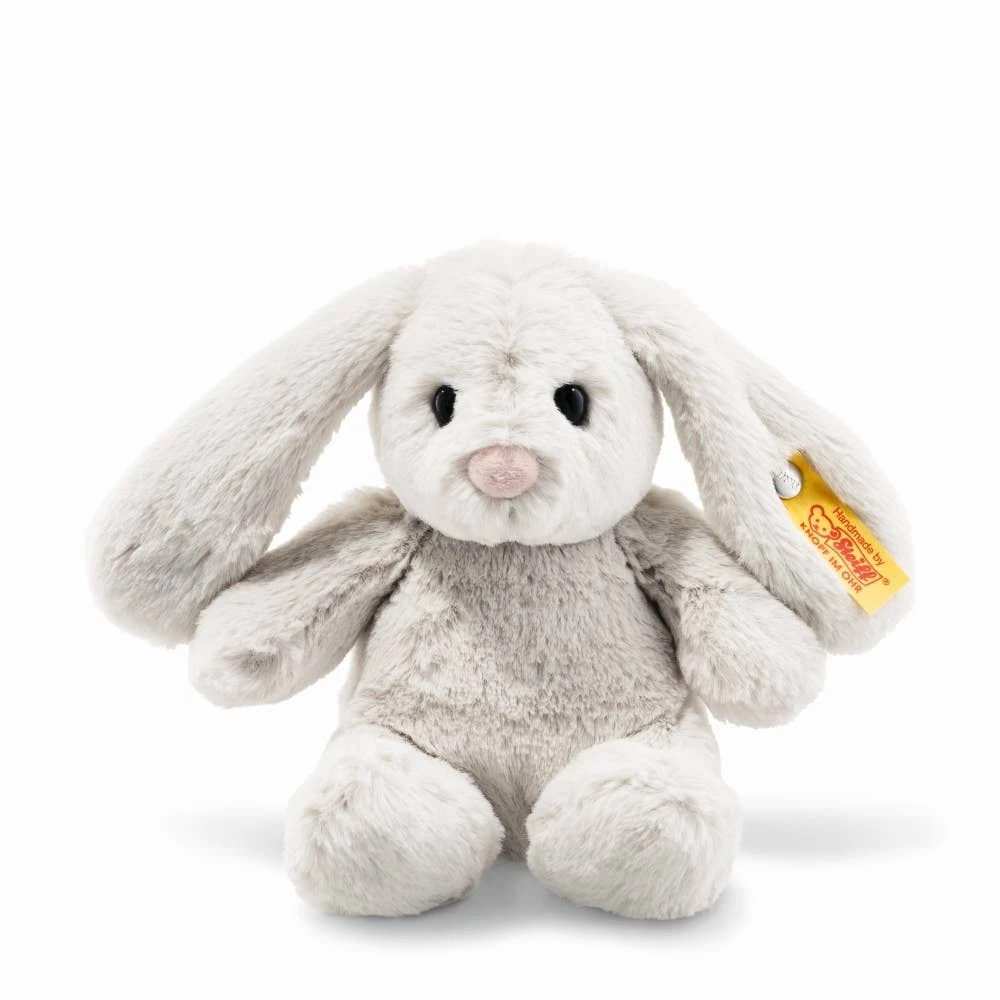 Hoppie Rabbit is a soft gray bunny plush ready to hop into your child’s heart. This cuddly companion features a pink nose, long floppy ears, and a lovable expression. With small beanbags in the bottom and paws, Hoppie can sit upright for play or display. She’s machine washable and safety tested, making her perfect for everyday snuggles. Available in a variety of styles, Hoppie also features Steiff’s classic “Button in Ear” to ensure quality and authenticity.