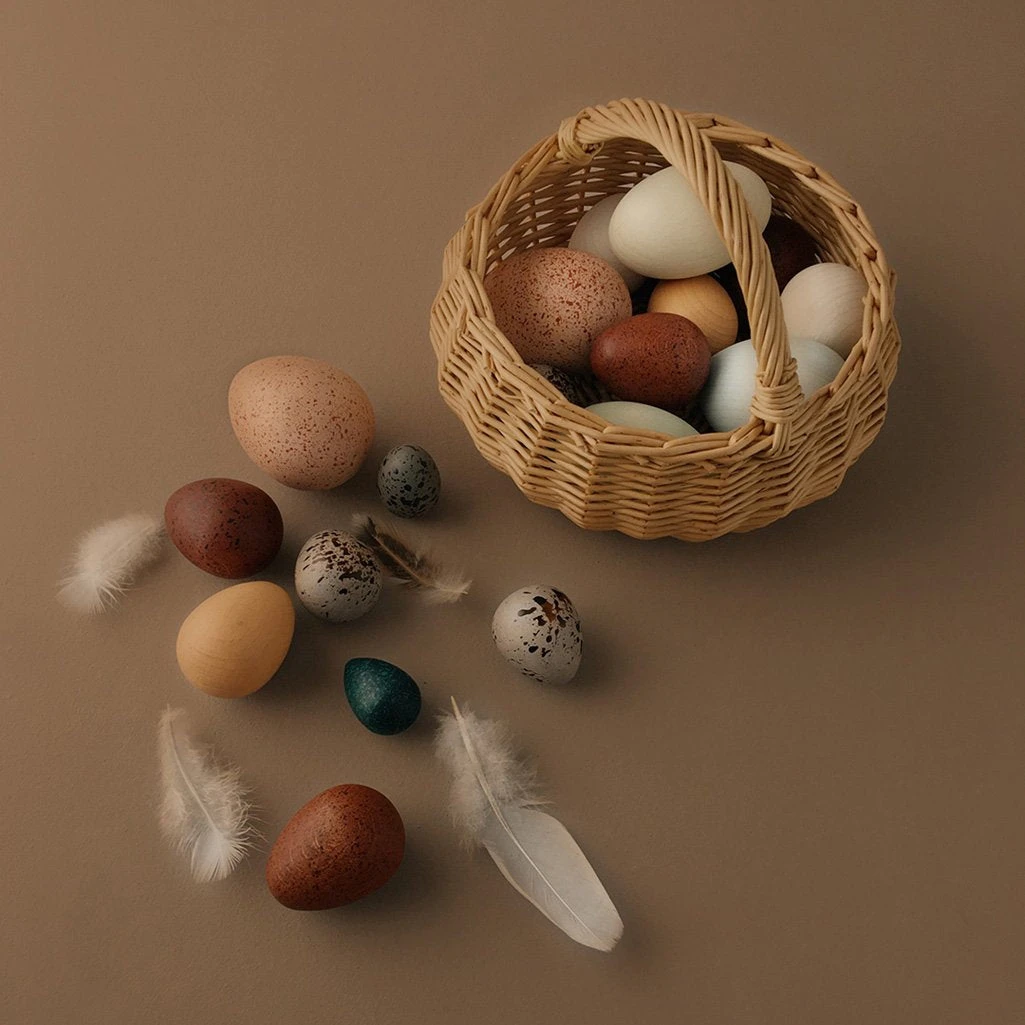 This Moon Picnic Wooden Egg Basket set is perfect for little hands to hold and feel the warmth of the wood, different sizes and curves, to roll, sort and count! Can be used as a sensory toy, for imaginative play or for decoration.
